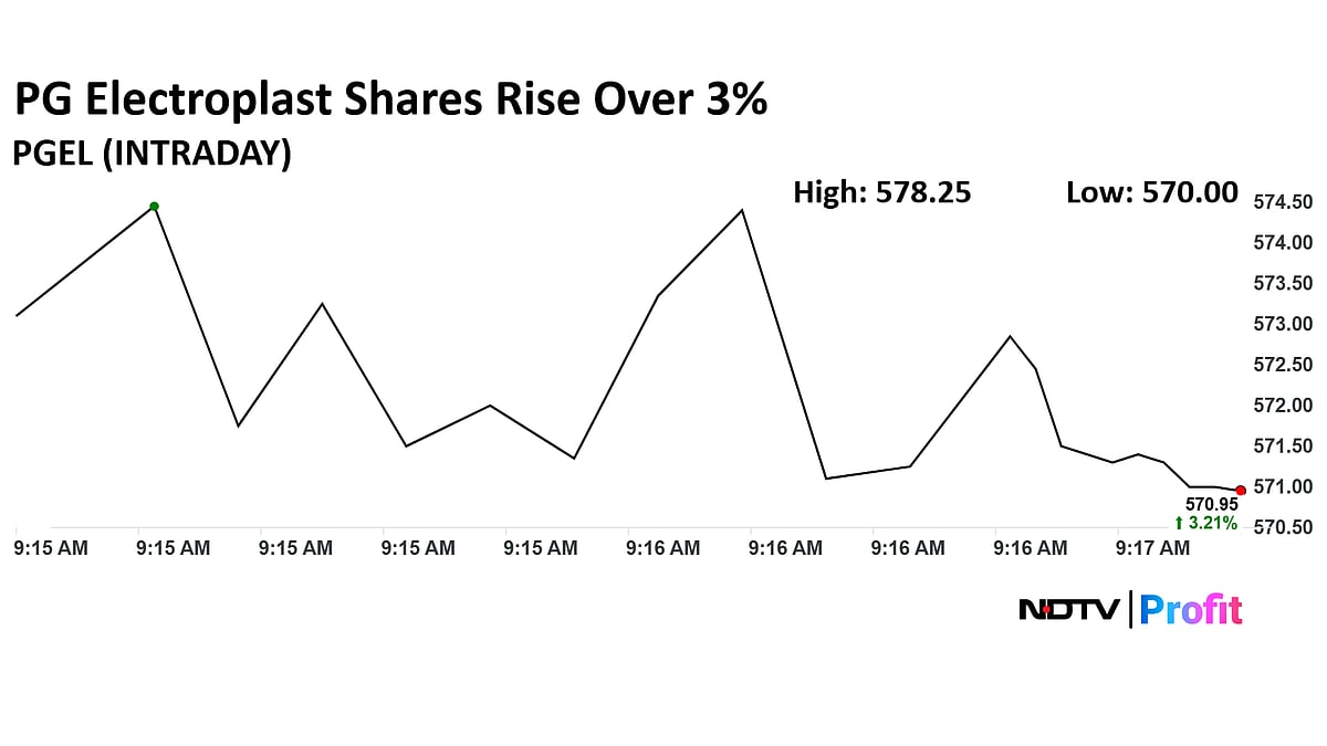 PG Electroplast stock rose as much as 4.53% during trade so far to Rs 578.2 apiece on the NSE. It was trading 2.39% higher at Rs 566.4 apiece, compared to an 0.64% advance in the benchmark Nifty 50 as of 9:27 a.m.