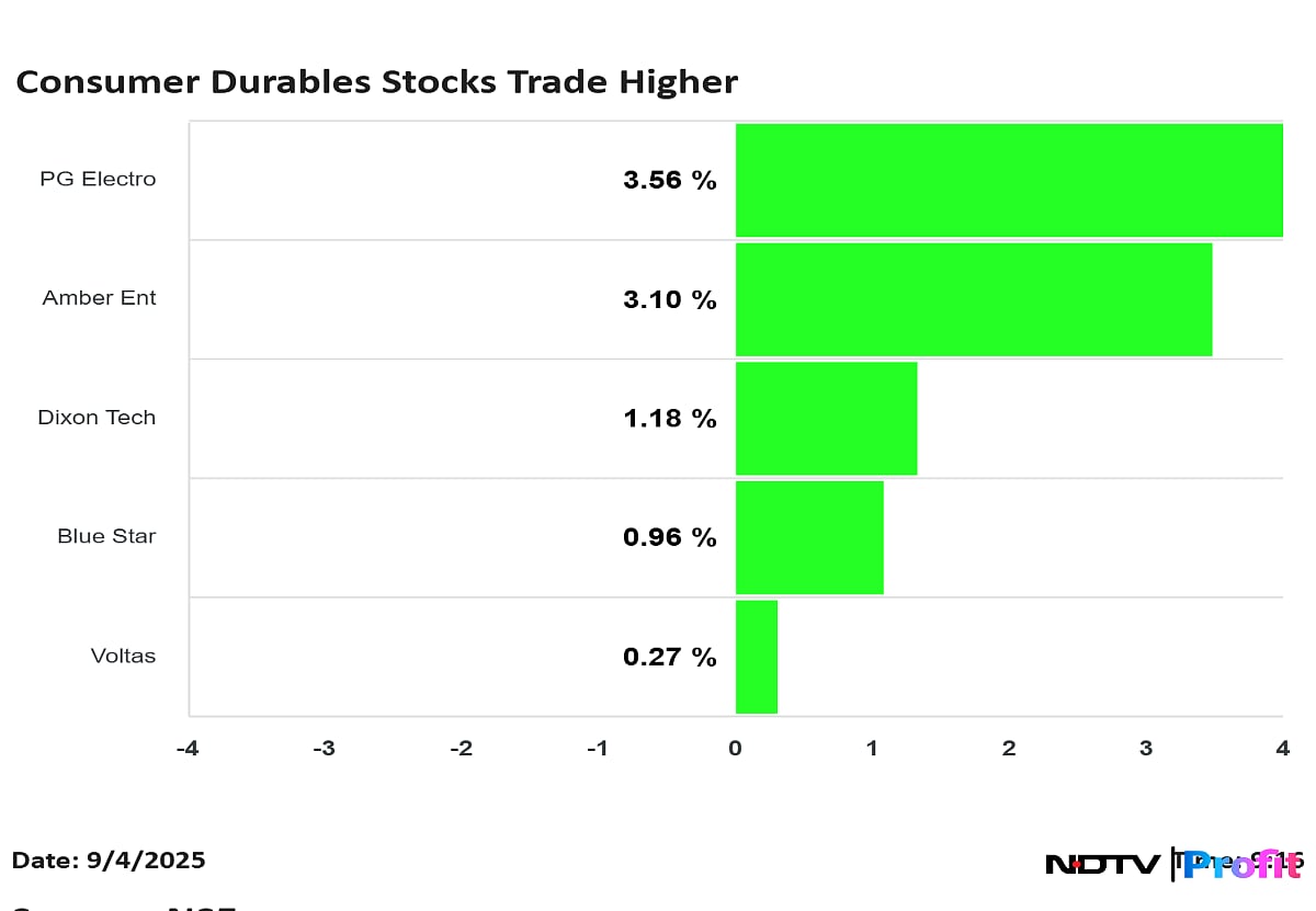 . Read more on Markets by NDTV Profit.Shares of major players in the consumer durables and electronics manufacturing services space, such as Voltas, Havells, and Dixon Technologies, have seen their stock prices rise.  Read MoreMarkets, Business ​NDTV Profit