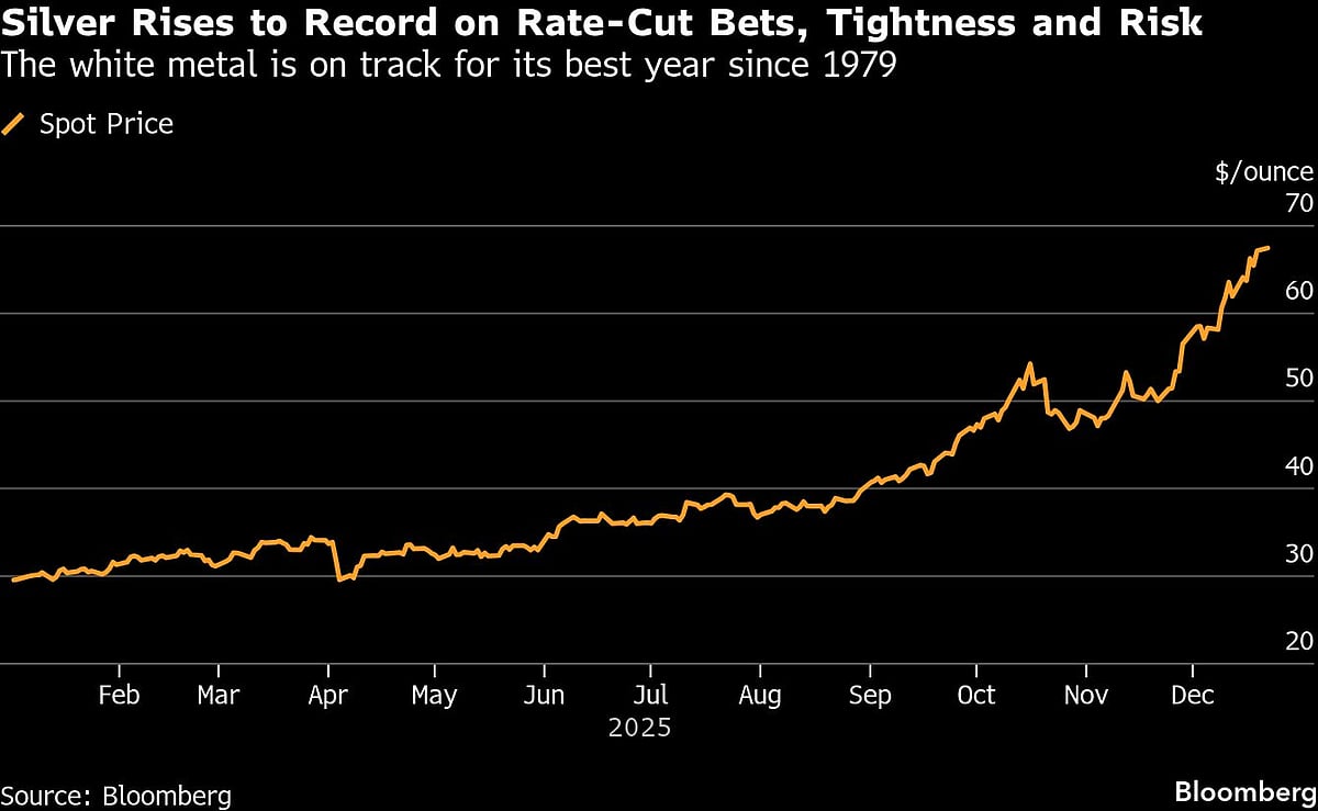 Precious metals are capping a historic year, with gold and silver both heading for their strongest annual gains since 1979. Silver has more than doubled and gold has surged about two-thirds, underpinned by increased central-bank buying and inflows into bullion-backed exchange-traded funds.